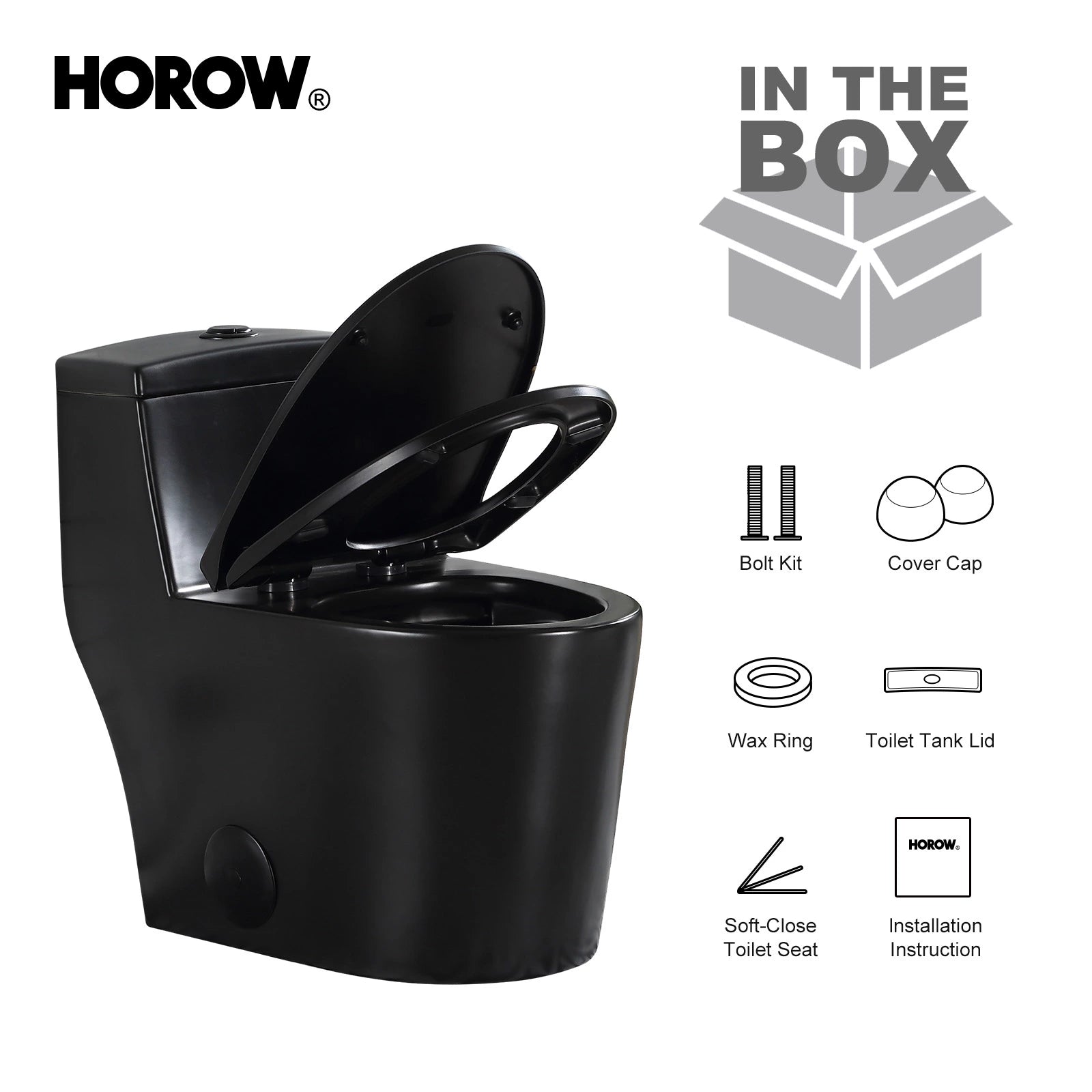 Includes Cover Cap, Bolt Kit, Wax Ring, Toilet Tank & Lid, Soft-Close Toilet Seat, and Installation Instructions—everything you need for a seamless, hassle-free setup.